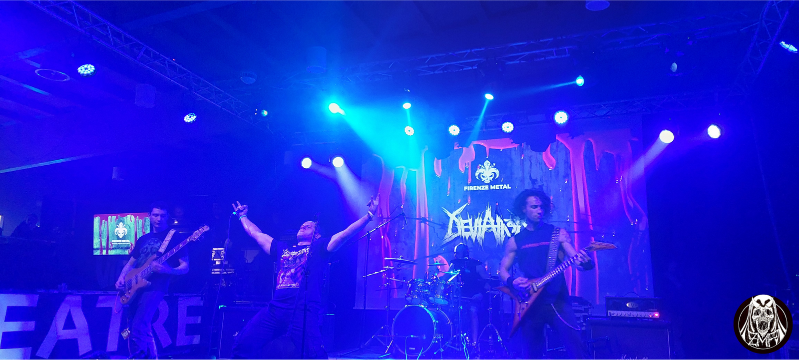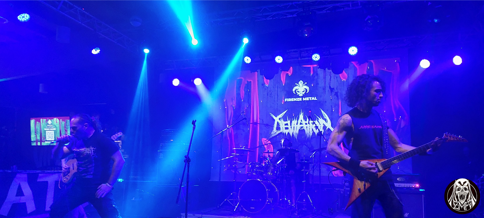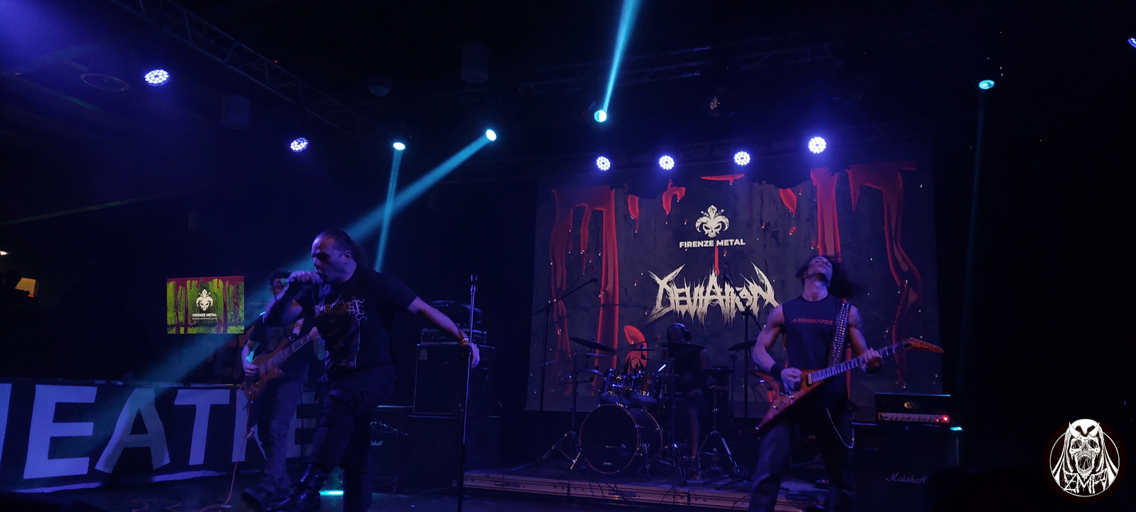 Dopo la consueta pausa, tocca ai Deviation prendersi la scena. Sarà anche una band molto recente, ma i nomi di chi ne fa parte non sono per niente nuovi, specialmente a livello locale. I componenti provengono tutti dai Suicidal Causticity e dai Disboskator, rispettivamente brutal death e thrash, che possono vantare tour e collaborazioni con grandi acts quali Incantation e Subhuman. Ad oggi, i fiorentini hanno prodotto solo un EP omonimo, dal sound esattamente a metà tra le band di provenienza, e non sono più nella pelle per suonarlo davanti ad un pubblico sempre più numeroso. Nikolas “ ”Gorgo“ ” Bruni si dimostra un ottimo performer con il suo potente growl, mentre il bassista Filippo Mannini e il chitarrista Davide Puliti si destreggiano alle grande, sostenuti dalla batteria di Thomas Passanisi. La folla risponde con moshpit, urla e continui incitamenti fino alla fine dello show, orchestrato perfettamente da performer esperti che sanno bene come far scatenare il panico.