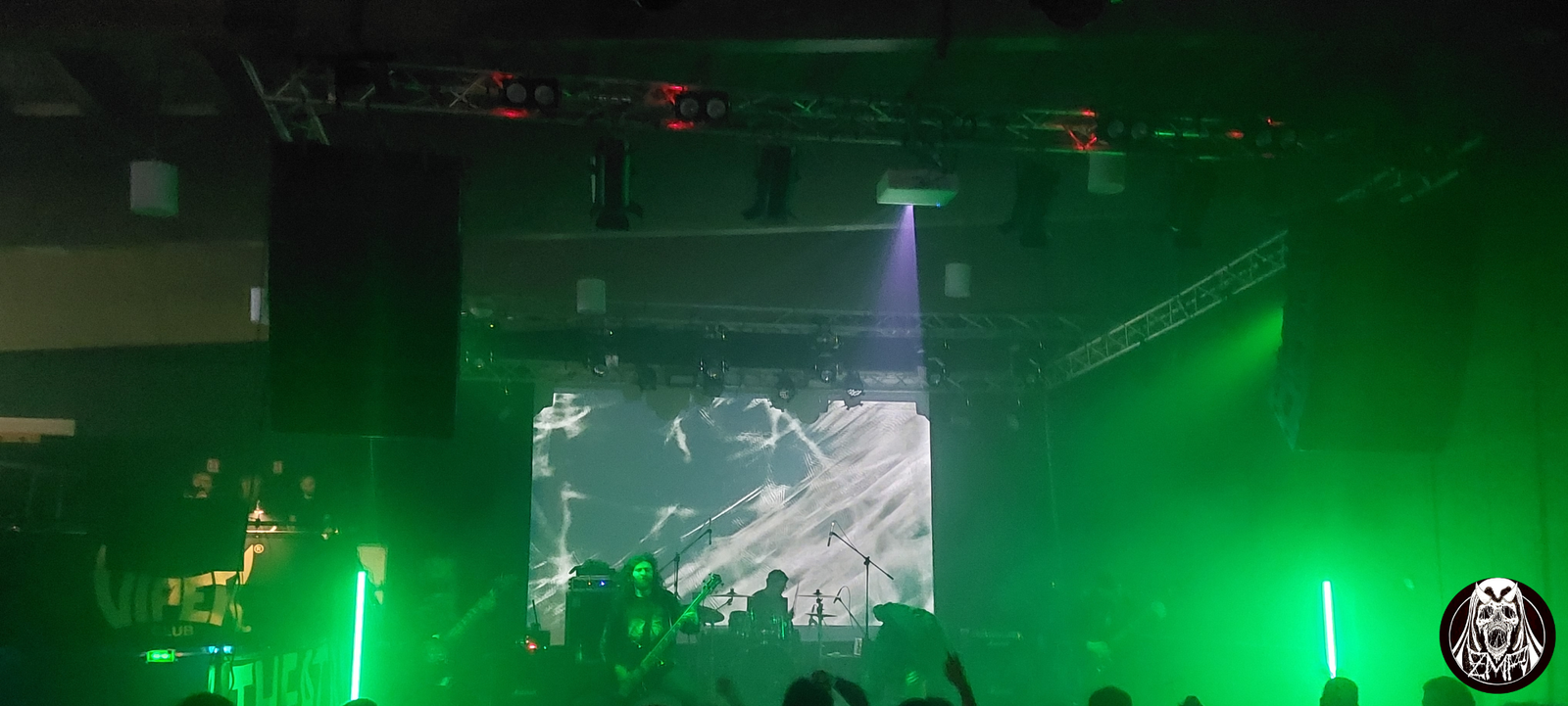 Ci avviciniamo alla fine della serata, ma l’entusiasmo è ancora alto. Molti, in giro per il Viper, hanno addosso la maglia con un logo che, leggendolo, è inequivocabile: Fulci. E, finalmente, è arrivato il loro momento. Il trio casertano è diventato una delle migliori realtà della nostra scena estrema, e il seguito che stanno avendo anche all’estero non è per niente dovuto al caso. Pensiamoci un attimo: una band che prende il nome da Lucio Fulci, il padrino del gore, e modella il proprio concept sulle sue opere trasformandole in testi, musica e esibizioni live dall’atmosfera cinematografica, con proiezioni e sample tratti dai film. Cose che, di solito, si vedono nell’elettronica, non nel death metal. Se poi consideriamo anche la bravura nel saper adattare lo scenario orrorifico alla brutalità della loro proposta, allora la tombola è assicurata. E tutto questo lo sanno fare dannatamente bene. Dome, Klem e Fiore, accompagnati dalla seconda chitarra e dal batterista, si intravedono in penombra tra le luci dei led posti ai fianchi, prendono la loro postazione e iniziano subito a picchiare duro verso il pubblico. La prova di ogni membro è ottima, soprattutto in brani come Tomb, Eye full of Maggots e Tropical Sun, eseguiti con un sound che, con il batterista in carne ed ossa, è ancor più distruttivo. Tutti si divertono, compreso i musicisti che dal palco, pur sembrando distaccati, si accorgono dell’atmosfera di puro delirio che si è creata, continuando a spingere fino alla conclusione piena di ovazioni. Così, i Fulci escono dal palco trionfanti dopo averci regalato, finora, la migliore performance della serata.