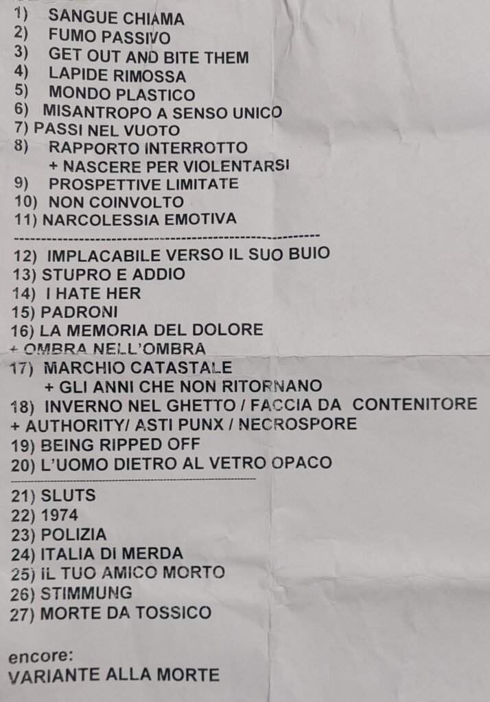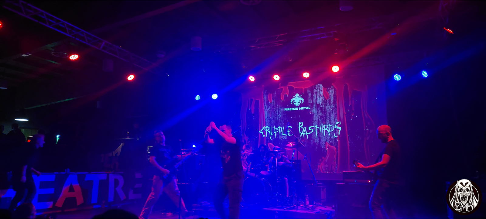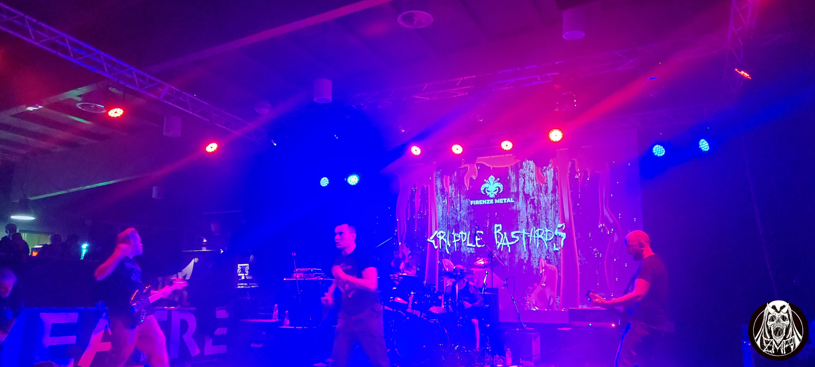 Siamo arrivati a mezzanotte, orario in cui, in teoria, la serata sarebbe terminata. E invece no, siamo ancora qui, perché manca ancora un’ultima band, quella che ci deve rifilare le mazzate finali per chiudere in bellezza. I Cripple Bastards salgono sul palco del Firenze Metal da headliner dopo aver festeggiato i 35 anni di una carriera ricca di lavori in studio, split album e numerosi tour in giro per il mondo e, dopo un lungo soundcheck, partono subito all’impazzata. I brani vengono sparati uno dopo l’altro con brutalità, senza pause, badando solo alla violenza delle loro bordate quali Fumo passivo, Sangue chiama e Misantropo a senso unico, tra le hit classiche. Der Kommisar e Schintu suonano composti e totalmente concentrati, mentre Giulio, con lo sguardo fermo e rabbioso, scarica sulla folla un growl gutturale alternato con i classici screaming taglienti 100% grindcore. E anche Raphael Saini alla batteria non scherza, picchiando con una velocità fulminante che non permette a nessuno di rifiatare. Il moshpit non si ferma mai, in molti arrivano sotto il palco trasportati dalle spinte e, dopo le tre hit Polizia, una razza da estinguere, Italia di merda e Morte da tossico, l’esibizione sembra finita. “Ciao a tutti, grazie”, dice improvvisamente Giulio, lasciando la folla un po’ disorientata, ma poi interviene Saini che, chiedendo a tutti se vogliono ancora un altro brano, convince il resto della band a suonare l’ultima Variante alla morte, chiudendo uno show di fuoco e fiamme.