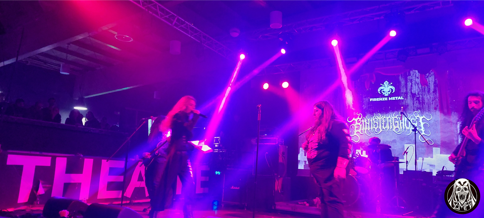 La partenza è prevista per le 19, ma tra i soliti preparativi, slitta di 45 minuti. Dopo lunghi soundcheck e verifiche tecniche, arrivano sul palco i Sinister Ghost che, freschi del loro ultimo album What’s Left of Human?, aprono la serata con una setlist che si concentra proprio sulla nuova release. I viareggini, dal sound a metà strada tra black, death e gothic, si ispirano apertamente ai Carach Angren che, come risaputo, hanno una presenza scenica che pochi altri possono vantare. E sulle stesse orme si muovono anche loro, in particolare il frontman Asmort, che sembra la reincarnazione di Seregor per il suo appeal vampiresco ma, soprattutto, per la sua presa sul pubblico. Memorabile il segmento a metà dello spettacolo, quando prende una copia della Bibbia e chiede alla folla: “Voi sapete cos’è? Per caso si mangia?”, masticando prima una pagina staccata a caso, poi riducendo l’intero libro a brandelli e lanciandone i resti sul parterre come coriandoli. Lo show prosegue senza intoppi, con Aelodh, Synugoth e Pontius che viaggiano spediti e compatti per dare supporto al loro singer, abile nel passare facilmente dal growl allo scream più vicino al black. L’esibizione dura poco, ma è convincente, con anche la presenza di Danny Metal come ospite, da parte di ragazzi giovani che hanno tutte le carte in regola per arrivare molto lontano.