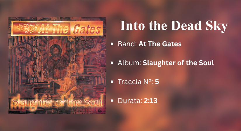 Into the Dead Sky è un altro intermezzo dalla funzione e dalla emotività simile. Con Slaughter of the Soul, gli At The Gates realizzarono il manifesto del melodic death metal, in cui i brani dovevano essere potenti, travolgenti, feroci. Di fatti, tracce come Cold, Suicide Nation e World of Lies scorrono forti ed energiche, ma tra di esse si distingue proprio questo interludio strumentale dove la tensione si trasforma in tristezza. Le chitarre acustiche introducono il brano con arpeggi morbidi, su cui si innestano chitarre elettriche dal timbro pulito e riverberato, intrecciandosi in modo semplice ed efficace e creando un’atmosfera contemplativa. Sullo sfondo, il basso lavora con note lunghe e profonde, mentre la batteria contenuta accompagna con tocchi leggeri, limitandosi a scandire i passaggi con una presenza discreta ma espressiva. Verso la fine, l’atmosfera cambia, diventa leggermente più tesa, ma non si appesantisce, chiudendo il brano con un alone di mistero, ma mantenendosi sempre introspettivo. Non si tratta dell’unico interludio strumentale dell’album, ma la conclusiva The Flames of the End è completamente diversa da Into the Dead Sky che, tra le due, è senza dubbio la più epica.