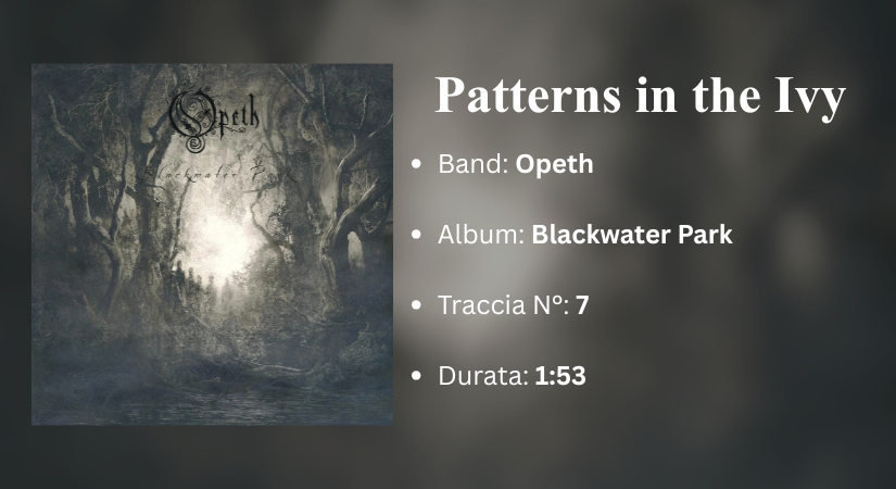 Con gli Opeth, il discorso cambia decisamente. Nelle loro opere, si trovano tracce lunghe in cui si alternano sezioni di death metal intenso e altre più melodiche ed introspettive che, prese singolarmente, sarebbero perfetti intermezzi strumentali. In Blackwater Park, le sezioni senza cantato di Dirge for November o della title-track rispecchiano queste caratteristiche, ma il buon Mikael Åkerfeldt ha deciso di piazzare un brano a sé stante che, proprio come breve interludio, funziona benissimo: Patterns in the Ivy. La traccia ruota attorno a un arpeggio in tonalità minore che alterna accordi aperti e dissonanze leggere. Non ci sono percussioni, né voce: tutto si regge sull’equilibrio tra vuoto e risonanza, con l’ingresso del pianoforte verso la fine che crea una carica emotiva costante fino al finale criptico. Un attimo di pura introspezione che, posta tra due tracce dalle forti sfuriate (The Funeral Portrait e Blackwater Park), rappresenta un respiro di pura quiete e riflessione.