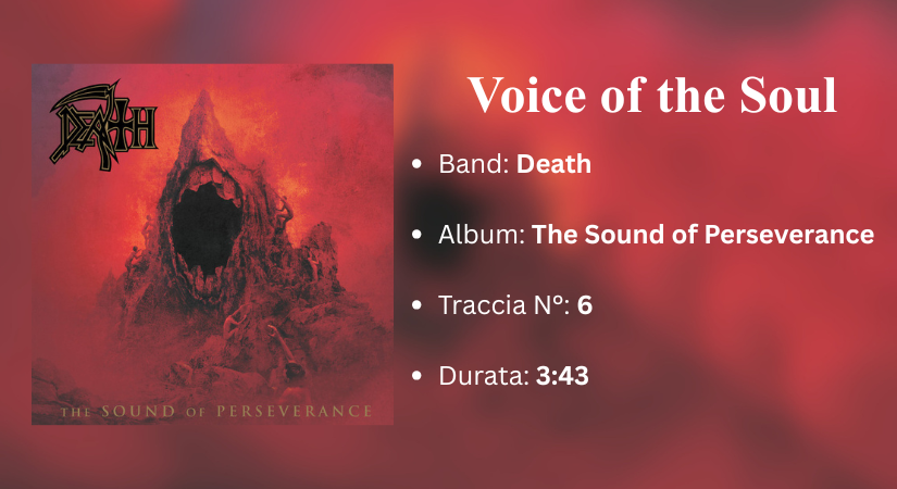 Voice of the Soul è senza dubbio il brano più conosciuto di tutti in questa categoria, non solo per essere uno dei pochissimi pezzi strumentali dei Death, ma anche per la sua sinfonia. Ogni disco della band di Chuck Schuldiner è a suo modo un capolavoro, e The Sound of Perseverance è quello dalle più ampie vedute, l’album che ormai mostrava tutto, tranne il death metal puro degli esordi. E soprattutto in questo brano, il cambiamento si nota a dismisura: non c’è batteria, non c’è il growl tagliente che caratterizza l’album, ma solo due chitarre che duettano in un intreccio di arpeggi e melodie in costante equilibrio, creando contrasti morbidi e una forte intensità emotiva. La chitarra solista emerge gradualmente, senza mai essere troppo virtuosa, riuscendo a non prevalere su quella acustica che, da buona base, la sostiene e la segue in ogni attimo fino al finale, in cui si spengono entrambe quasi allo stesso modo. In un album pieno di tracce tecniche, precise, variegate e potenti nell’impostazione, Voice of the Soul si distingue nettamente, mostrando un lato che, fino ad allora, nell’identità dei Death, si era soltanto intravisto.