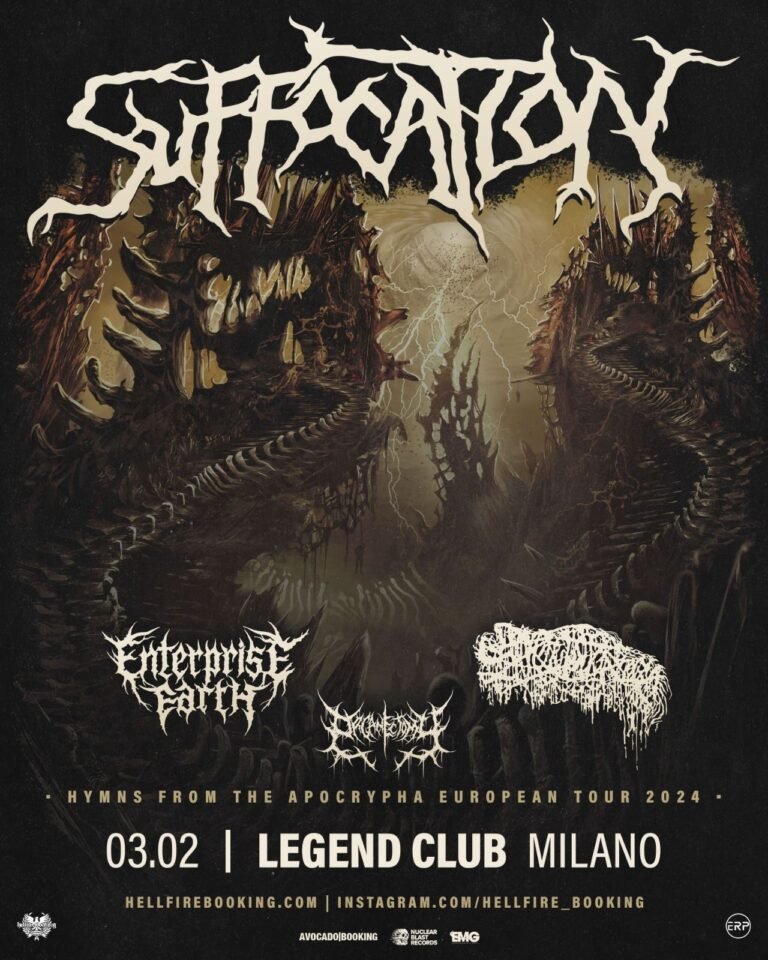 È bastato un anno ai Suffocation per tornare in Italia. Anzi, meno. L’ultima data dei deathsters newyorkesi risale al 7 maggio 2023, quando a Venezia si sono esibiti con Fulci, Hobos e Fate Unburied. Ed ora, per promuovere il nuovo Hymns from the Apochrypha, eccoli di nuovo nel nostro Paese, questa volta a Milano, accompagnati da una corazzata travolgente formata da Organectomy, Sanguisugabogg e Enterprise Earth. Insomma, la serata che offre il Legend Club è una di quelle imperdibili non solo per chi ama il death metal più tecnico e brutale, ma anche (e soprattutto) per chi va a caccia di quelle band che hanno scritto intere pagine di storia nella musica estrema. E l’affluenza di pubblico, non a caso, è consistente: l’apertura dei cancelli è prevista per le 18:30, decisamente presto, ma già dalle 18 la fila per entrare nel locale è lunga. Il preludio di una serata spaccaossa che registrerà un inaspettato sold-out.